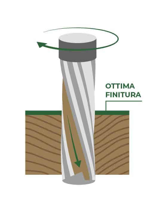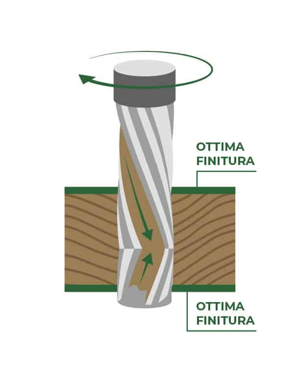 Questo comporta una perfetta finitura sia sopra (grazie alla parte negativa che spinge lo scarto in basso) che sotto (grazie alla parte positiva che spinge lo scarto in alto). È la scelta migliore quando devi lavorare legni che necessitano di una finitura perfetta da entrambi i lati del pannello di legno.