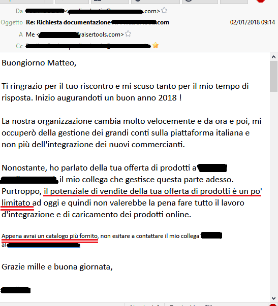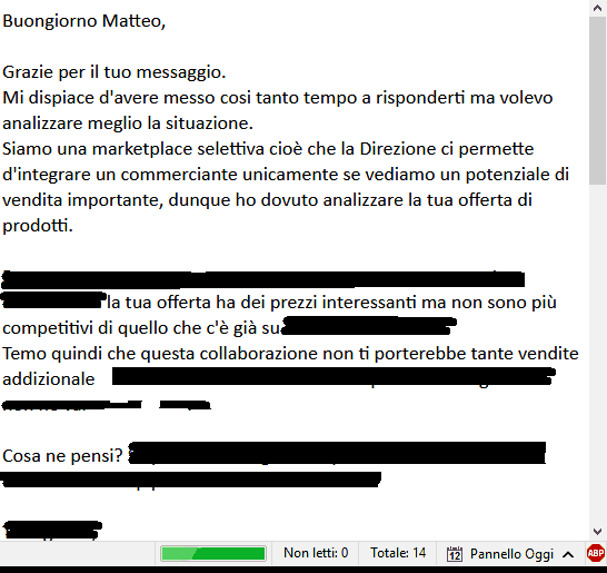 La mail finisce con il “Cosa ne pensi?” e, le mie speranze e il mio cuore si sono un po’ addolciti dato che mi hanno dato modo di spiegare bene la mia offerta e le nostre attenzioni.